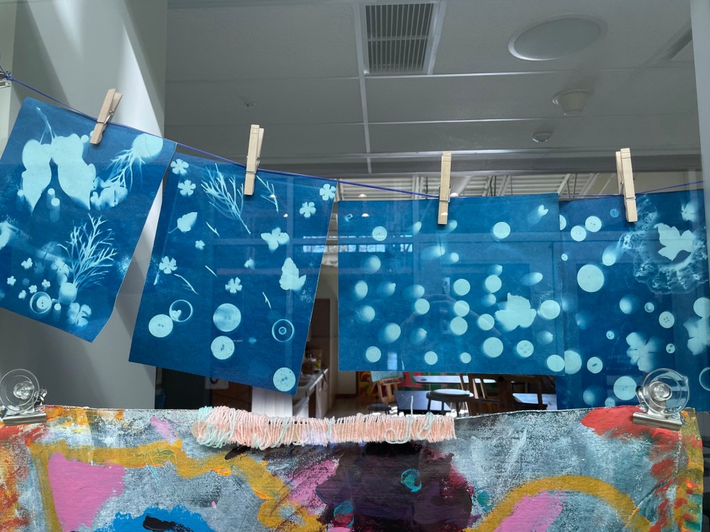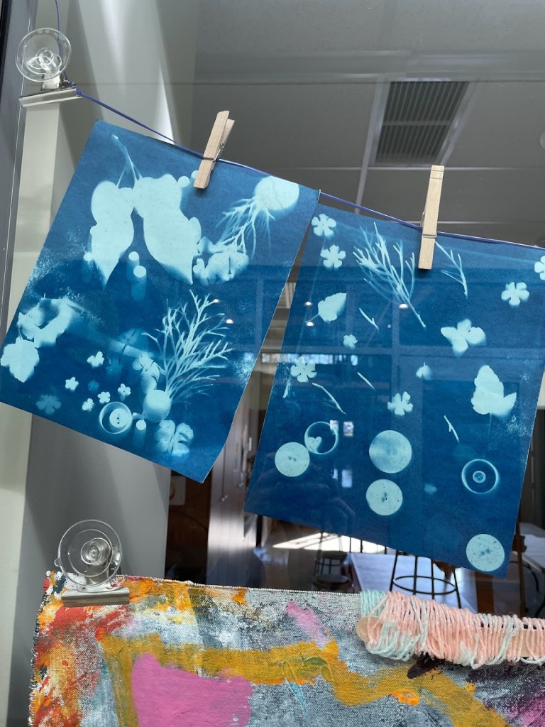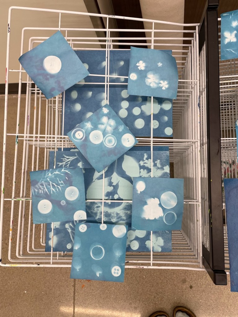 Students used found objects such as plants, buttons, ribbons, etc. to create cyanotype exposures or sun prints.