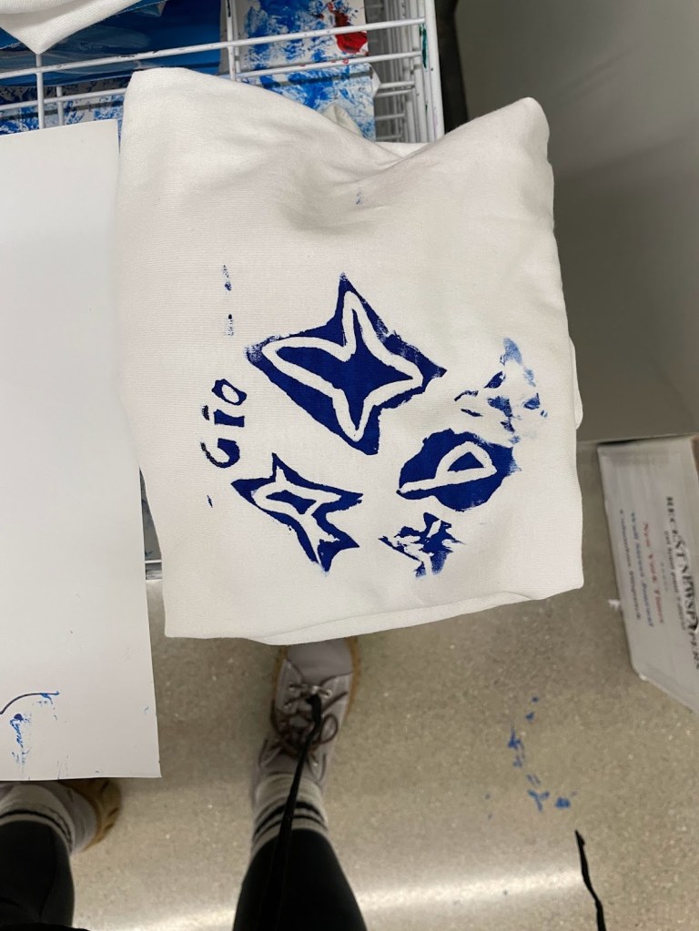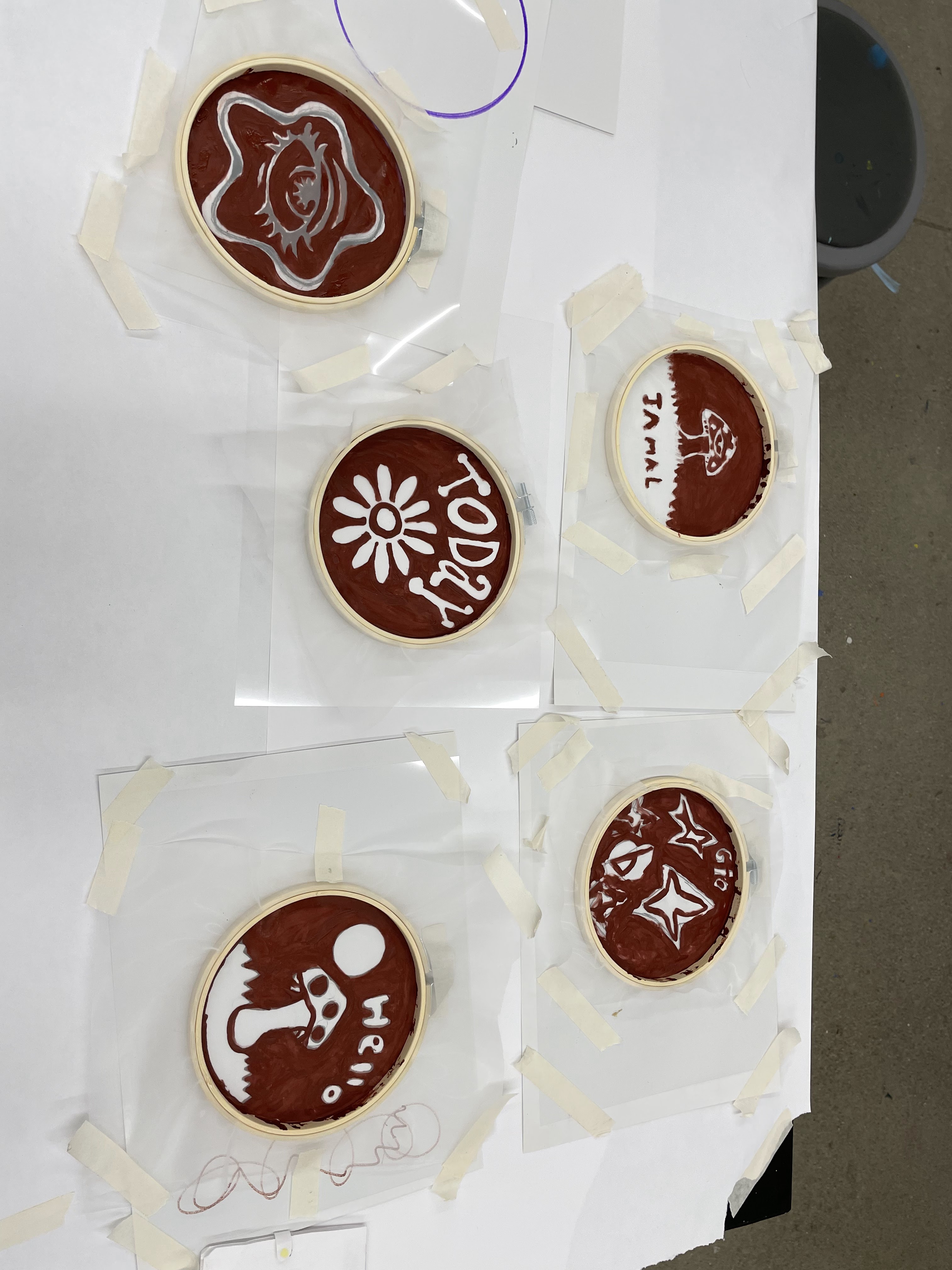 For this assignment, we used emboridery hoops, screen filler, and their designs to make an inexpensive and accesible screen print, they printed on shirts and paper.