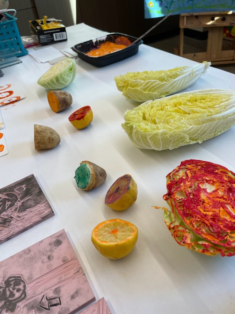 Students used a cabbage, potatoes, and lemons to create their own abstract veggie prints.